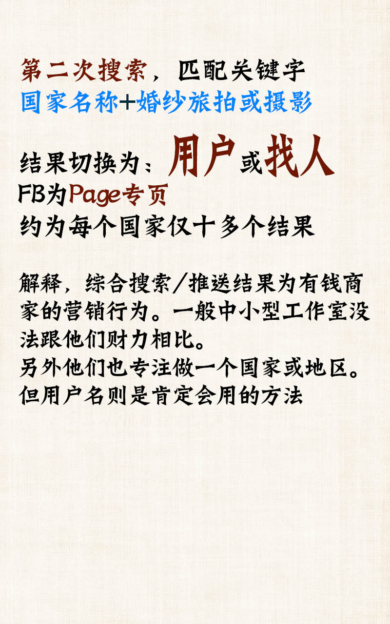 结果后切换显示为“用户”,w博为“找人”,FB就是Page。不要综合的,综合的是各个商家拼实力做宣传的实力体现。而用户就是他们的名字——他们一定会用这些关键字做用户名。