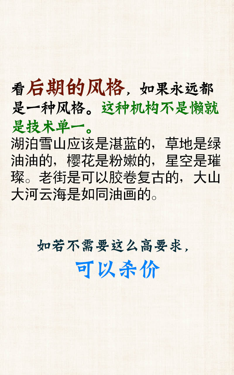 同样的,看后期的风格,如果永远都是一种风格,无论是山顶,还是湖边,还是街道还是教堂。这种机构不是懒就是技术单一。