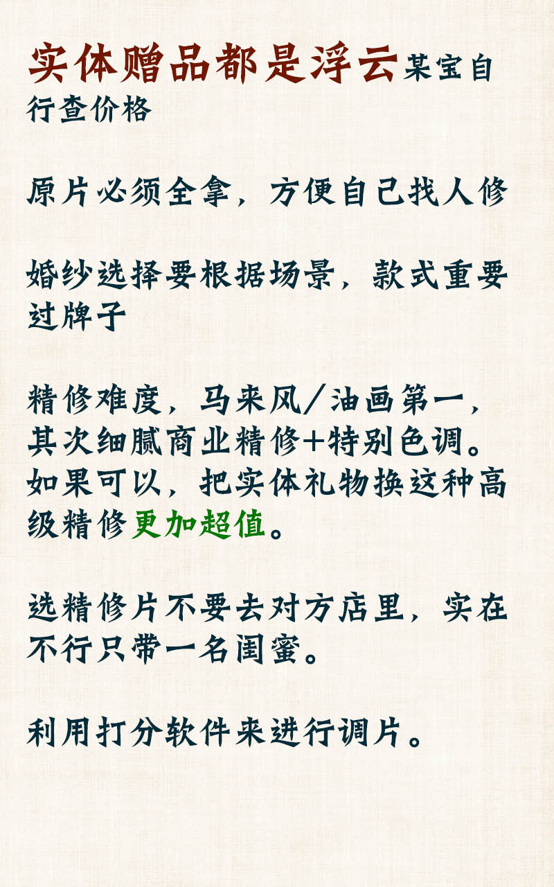 选择精修不要去她们办公室,如果非得去带一个品味类似闺蜜且必须一个,不要带老公。很多影楼的利润一大半的利润时候来自于后期的扩展。你如果不要相册摆台相框什么了,忽悠你更多精修是必要。如果带老公去,在一个封闭的温馨小包厢里,面对专业的客服推销,男生一般招架不住且要顾及面子随便答应给钱。而闺蜜则会跟你拉开架势一起对外。