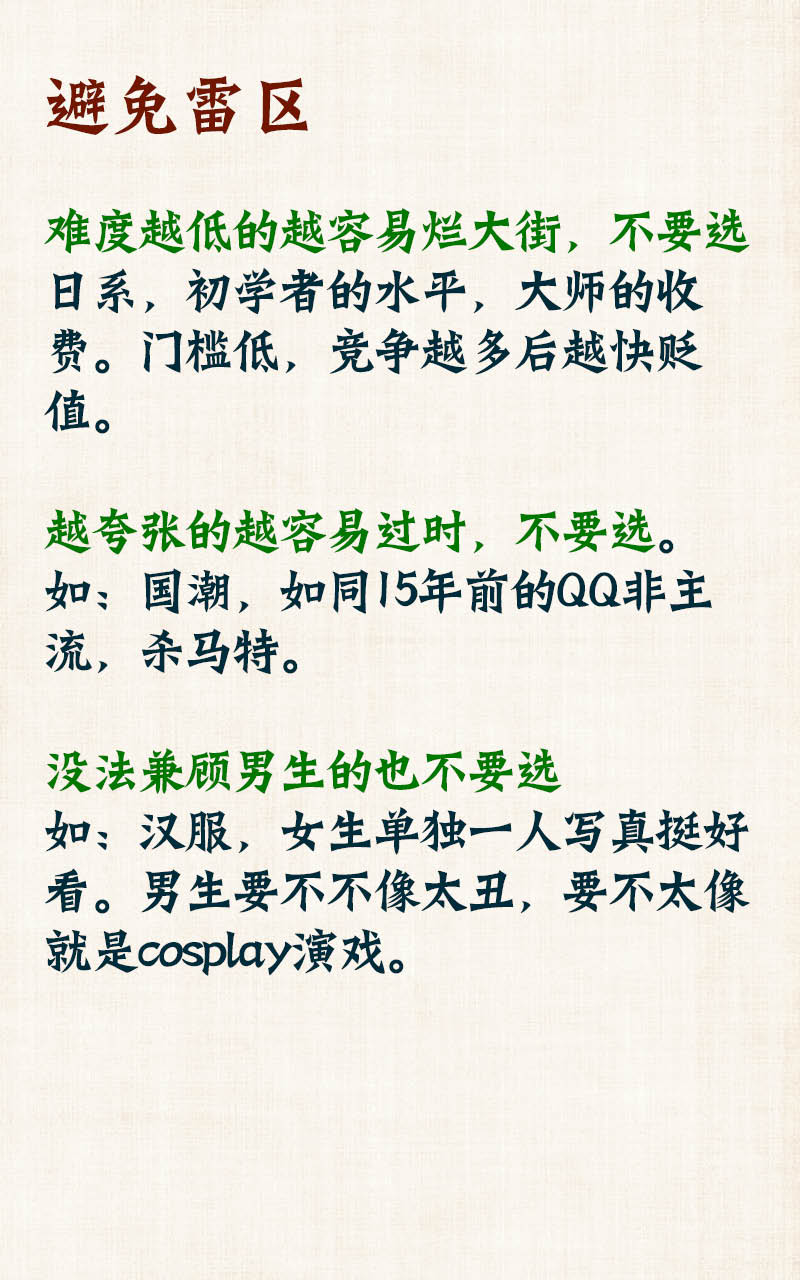 难度越低的越容易烂大街,不要选。如日系,太没难度了,我们公司设计师那种PS预设一大堆。而且那些日系旅拍的基本都不是婚纱,就是便装找些乡下地方模仿日本人的普通生活照加胶卷风格而已。现在这种风格的影楼工作室越来越多,现在你花两万,以后拍滥了,你这就值八百。